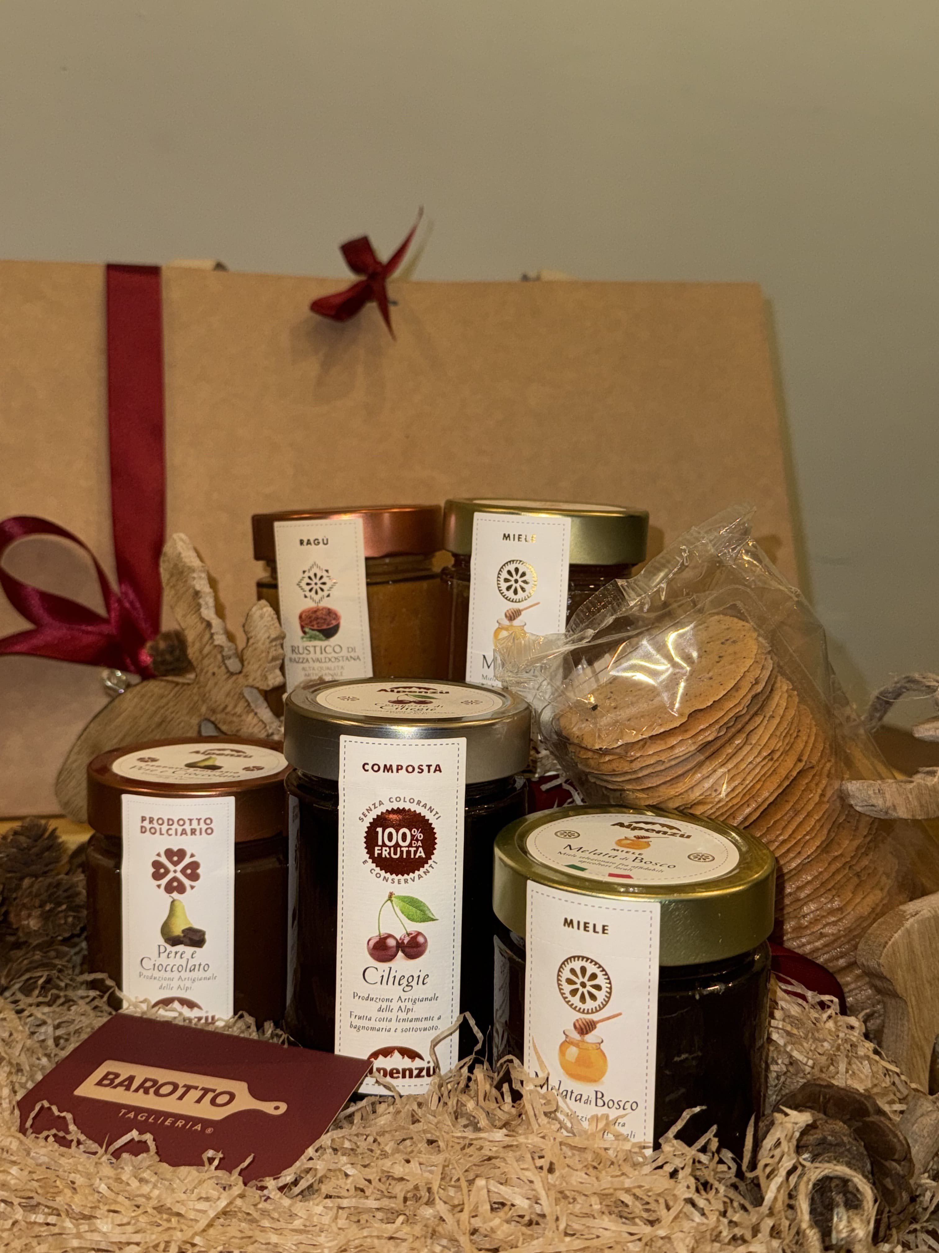 An important and complete basket, designed to bring to the table a full selection of mountain flavours, from aperitivo to dessert.